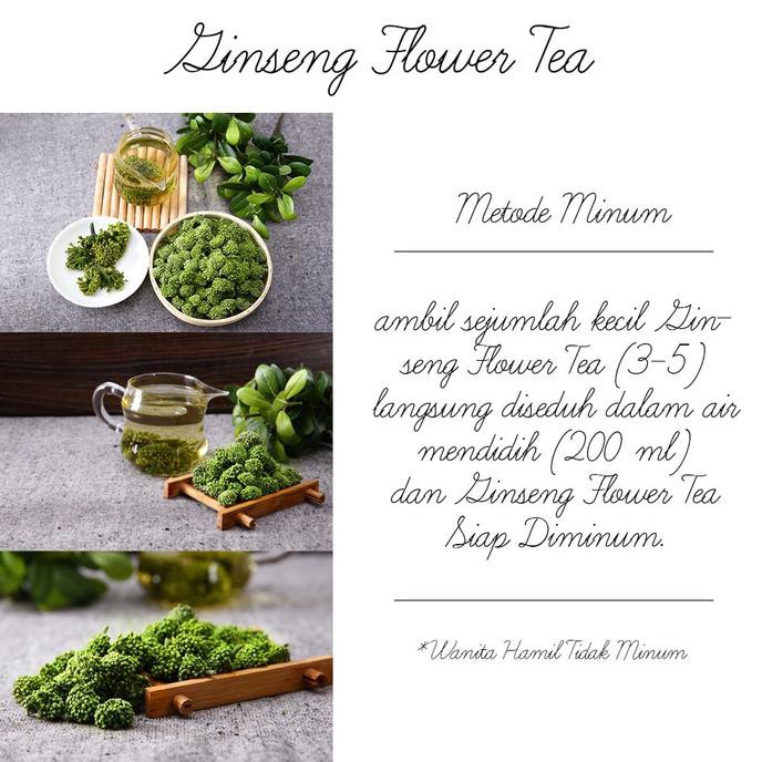Ginseng flower dijuluki sebagai Raja Herbal sejak dahulu kala. Selain akarnya mempunyai khasiat tinggi, bunga ginseng juga mempunyai manfaat yang luar biasa juga. Penelitian klinis telah membuktikan bahwa, teh bunga ginseng jika dikonsumsi secara rutin mampu memberikan manfaat yang baik, seperti: Membersihkan hati dan memperbaiki penglihatan mata. Berfungsi sebagai detoksifikasi. Tidak mengandung theophylline (zat yang biasanya ada dalam daun teh), namun mampu meningkatkan kebugaran tubuh. Diuretik. Sangat baik untuk penderita pembengkakan kelenjar prostat.