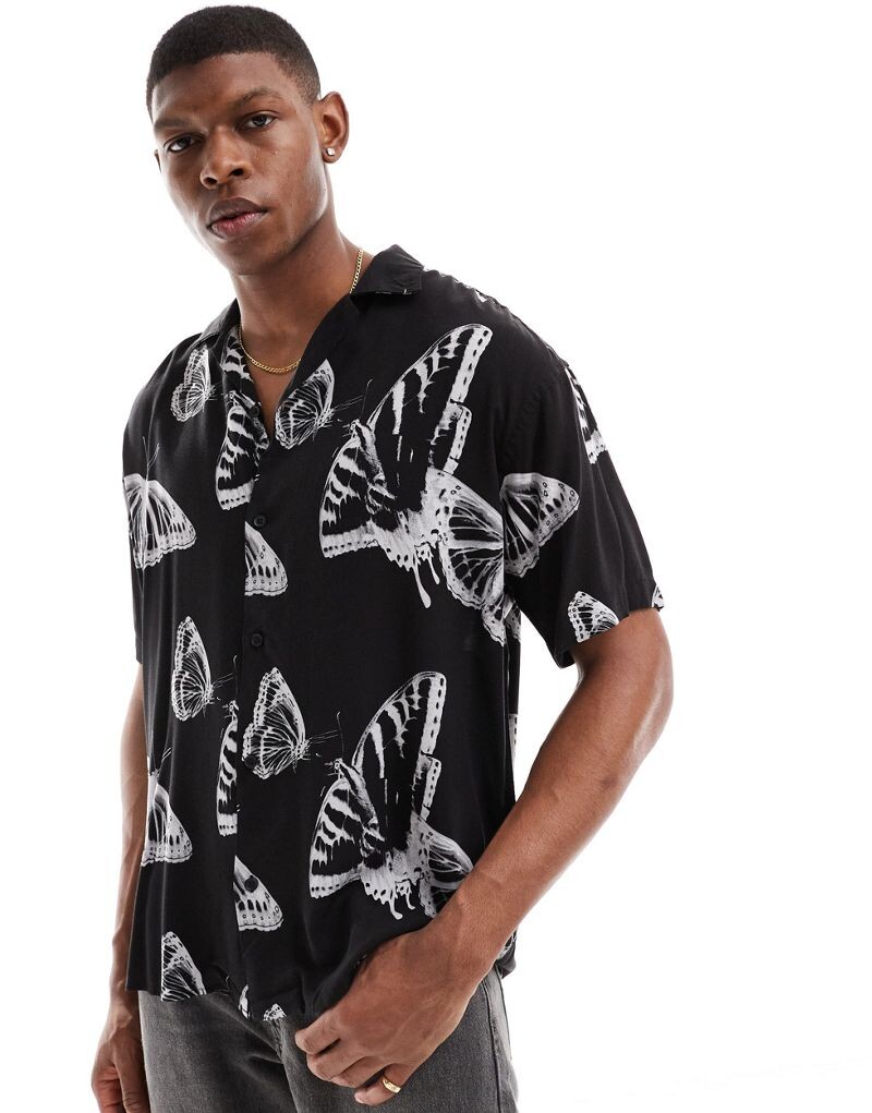 Jack & Jones — черная рубашка оверсайз с принтом бабочки и лацканами