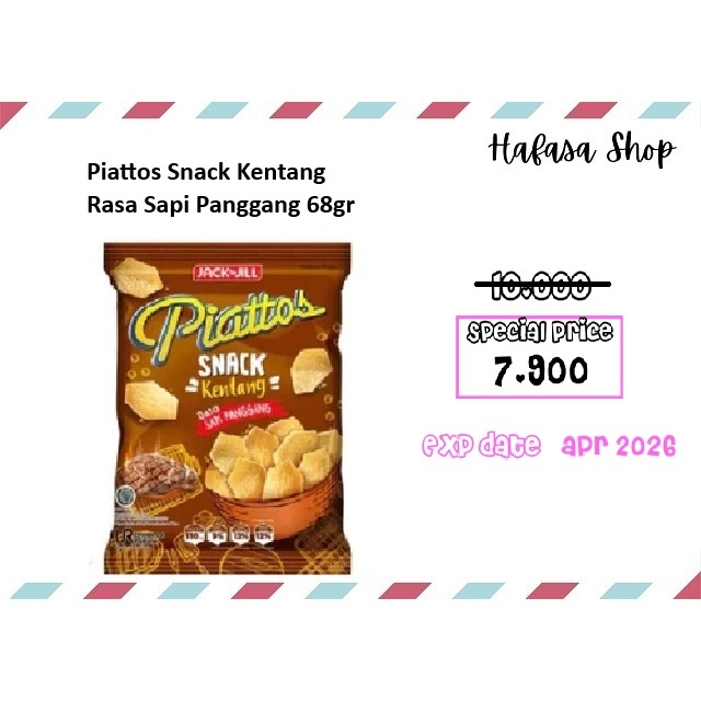 Adalah sebuah keripik kentang berbentuk unik. Terbuat dari kentang asli berkualitas, yang diolah secara higienis dan modern menggunakan teknologi tinggi. Kentang yang telah dicuci bersih dan dikupas di potong berbentuk segi 6 yang unik. Diiris tipis dan digoreng pada suhu yang tepat, sehingga menghasilkan kerikpik kentang berbentuk segi 6 dengan tekstur yang renyah. Dibalur dengan taburan perisa sapi panggang bubuk yang nikmat, memberikan rasa asin gurih yang nikmat pada keripik kentang. Dikemas dalam kemasan kantung ukuran 68 gram untuk menjaga rasa dan kualitas keripik. Cocok dijadikan cemilan saat sedang bersantai atau berkumpul bersama teman. Rasakan nikmatnya keripik kentang berbentuk unik pada Piattos Snack Kentang Sapi Panggang 68 g.