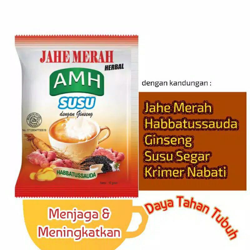AMH Susu Jahe Merah Merupakan Jahe Merah yang diperkaya dengan Habbatussuda, Gingseng, Susu dan Kandungan herbal lainnya yang merupakan solusi herbal yang sangat lengkap dan terjamin mutunya untuk menjaga daya tahan tubuh Anda agar senantiasa sehat dan terhindar dari penyakit.