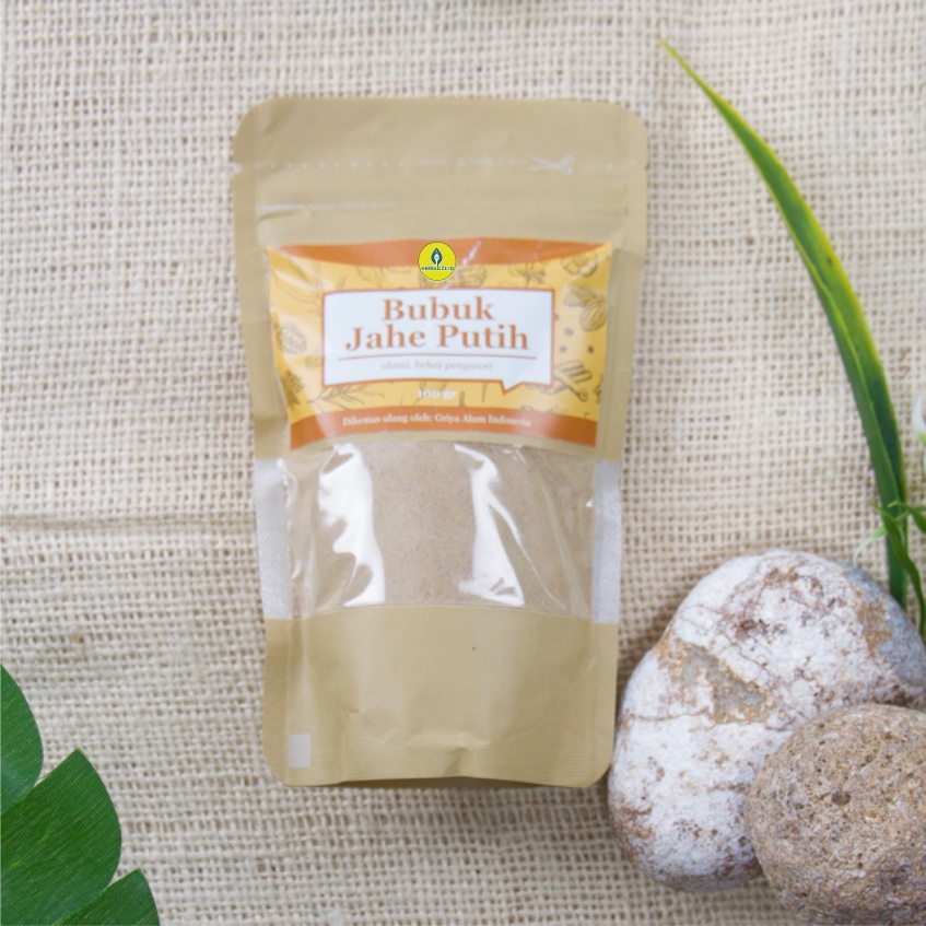 Jahe Putih yang dicampurkan kemudian digiling halus dan disaring sehingga menjadi bentuk serbuk murni, masih mentah belum dicampur bahan lain.