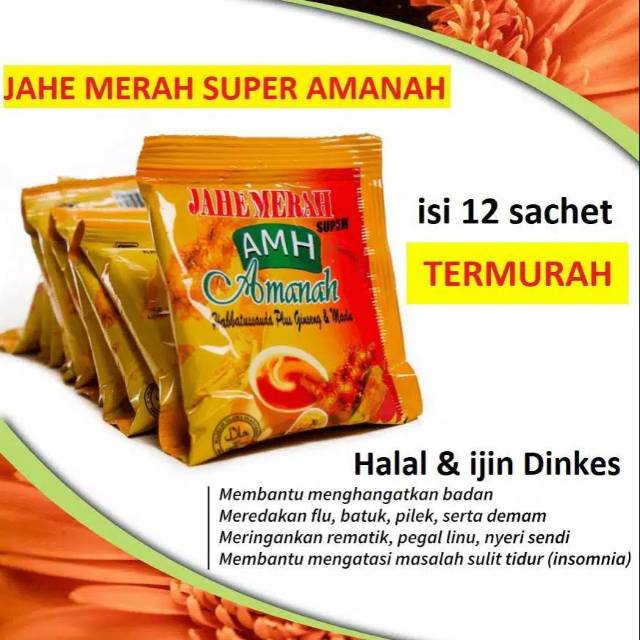 Jahe Merah Amanah Super bermanfaat untuk mengatasi: Rematik, perut kembung, nyeri persendian, pegal linu, sesak nafas, batuk berlendir, susah tidur, demam, sulit buang air besar, sering kesemutan, asam urat, kolesterol, darah tinggi, serta menambah stamina dan gairah.