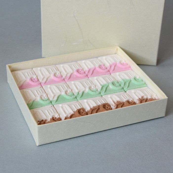 A mild and sophisticated Japanese dessert from Kyoto, made of 100% Wasanbon Sugar. Wasanbon Sugar is known as one of the finest grained sugars, made in traditional wooden mold. With its gentle sweetness and elegant beauty, it is complementing perfectly your cup of green tea or bowl of matcha.