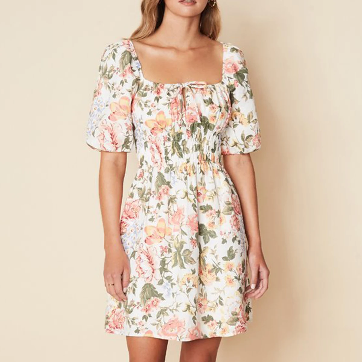 Jastie, женские летние платья, 2022, Safflower, зеленые листья, принт, квадратный вырез, пышные рукава, мини платье, богемное, бант, грудь, Пляжное Плать...