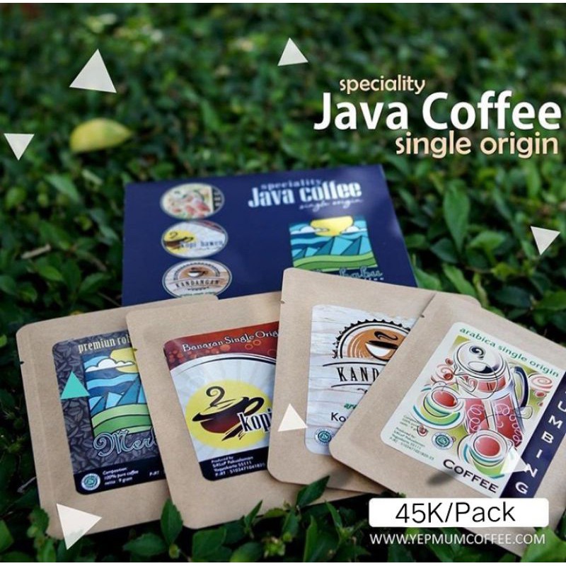 Java Coffee adalah 1 pack coffee yang berisi 4 drip coffee dengan varian yang berbeda beda antara lain: Merbabu Coffee, Sumbing Coffee, Bawen Coffee, Kandangan Coffee.