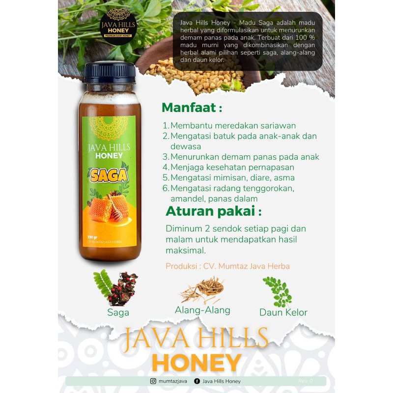 Terbuat dari 100% raw honey yang dikombinasikan dengan herbal alami pilihan seperti daun saga, kayu manis, daun kelor, dan alang-alang. Sangat direkomendasikan untuk sariawan, batuk, panas dalam, masalah pencernaan, dll.