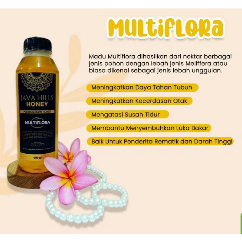 Madu Multiflora dihasilkan dari nektar berbagai jenis pohon dengan lebah jenis Meliffera atau biasa dikenal sebagai jenis lebah unggulan.