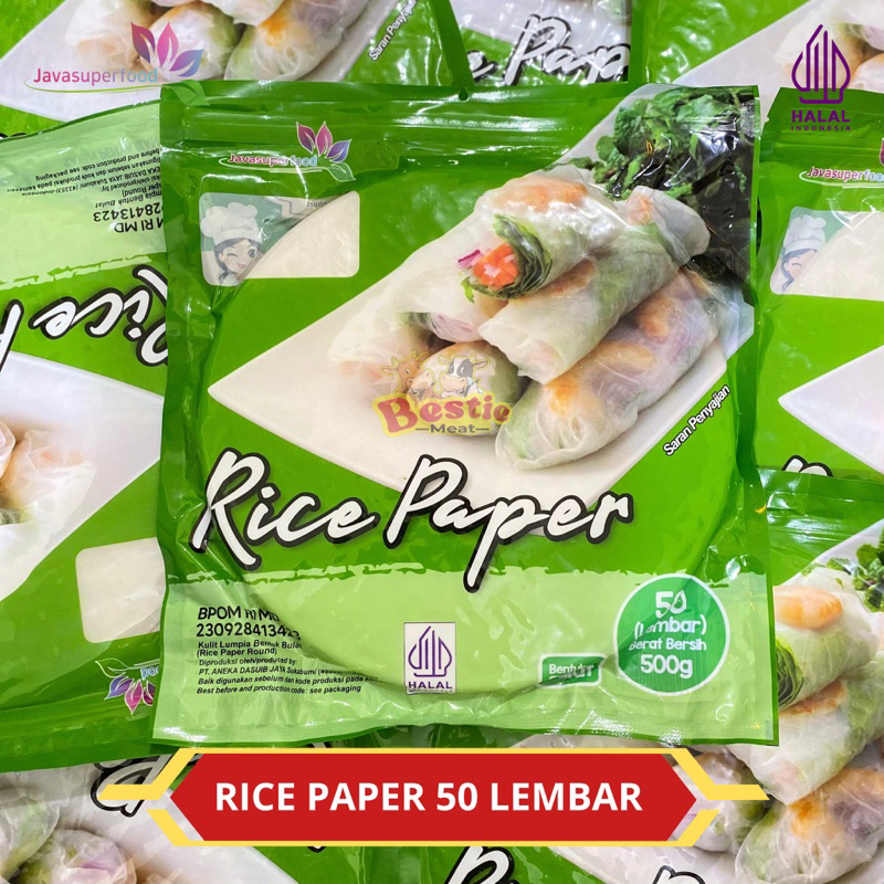 Rice paper kotak HALAL dari Javasuperfood, adalah sejenis kulit lumpia yang Dibuat dari tepung beras. Rice paper digunakan setelah dicelupkan/diolesi dengan air matang hingga lembek. Rice paper dapat dibuat menjadi spring roll.