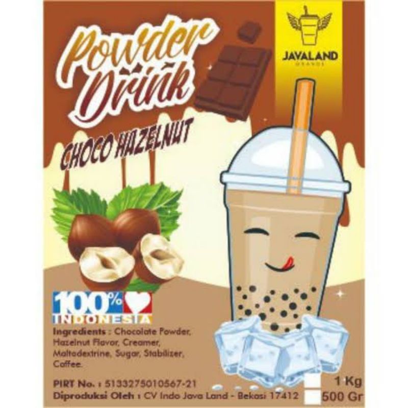 Bubuk minuman rasa Choco Hazelnut kemasan 500gr merek Javaland. Dengan varian rasa yang nikmat dan berbeda. Untuk minuman bubble drinks, milk shake, ice blended, tambahan perasa silky puding, kue cubit, dan lain lain.