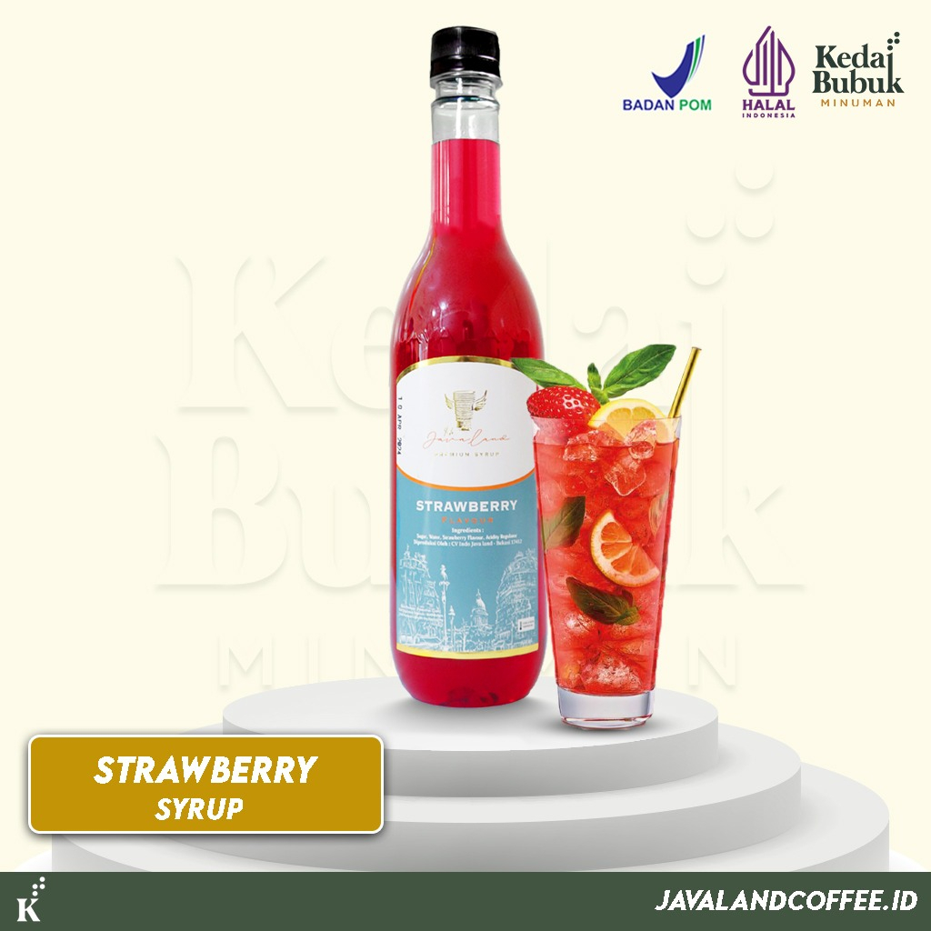 Sirup Javaland Premium rasa Strawberry, cocok untuk campuran berbagai jenis minuman dan kopi.