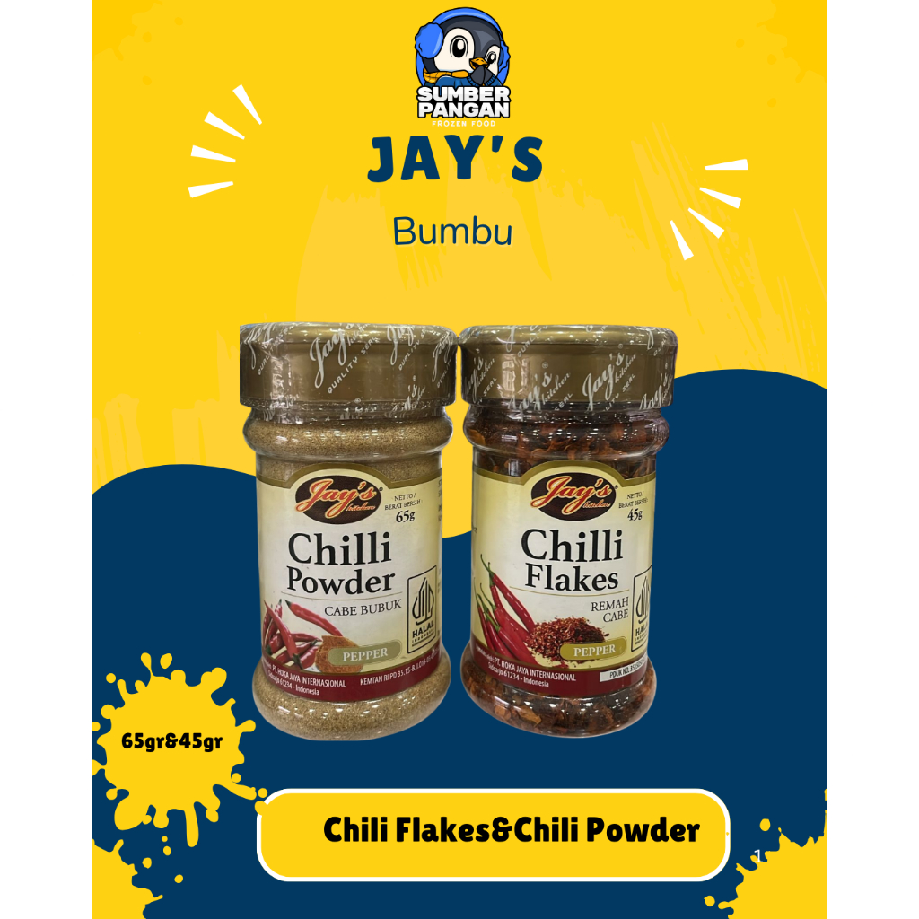 Jay's Chili Powder adalah bubuk cabai yang diproduksi oleh Jay's Kitchen. Bubuk cabai ini dikenal karena aroma khasnya yang hangat dan kaya rasa, serta kemampuannya untuk menambah kelezatan pada berbagai macam hidangan. Bubuk cabai ini terbuat dari cabai kering pilihan yang dihaluskan, dan seringkali dicampur dengan rempah-rempah lain seperti ketumbar, jintan, bawang putih, dan oregano.