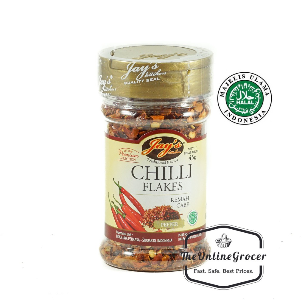 Jay’s Chilli Flakes terbuat dari potongan cabe kering pilihan yang kemudian dicincang. Chilli Flakes banyak digunakan di café ataupun restoran. Taburi di atas makanan anda seperti pizza atau pasta untuk menambah kelezatan tanpa terlalu mengubah rasa dari makanan tersebut. Dapat digunakan juga untuk melengkapi masakan-masakan lezat anda.
