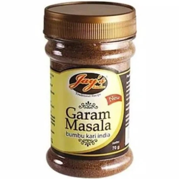 Garam Masala merupakan ramuan bumbu masakan kari India yang mengandung rempah, lada hitam dan kapulaga. HALAL MUI.