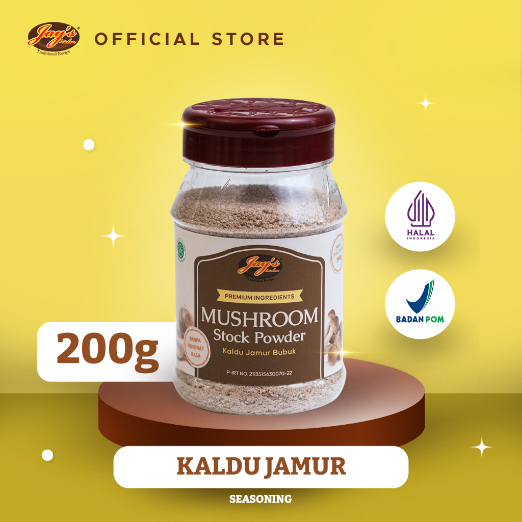 Mushroom Stock dari Jay's adalah bumbu kaldu jamur bubuk yang dibuat dari sayuran segar pilihan dan bumbu-bumbu yang sehat, alami tanpa pengawet dan tanpa tambahan MSG