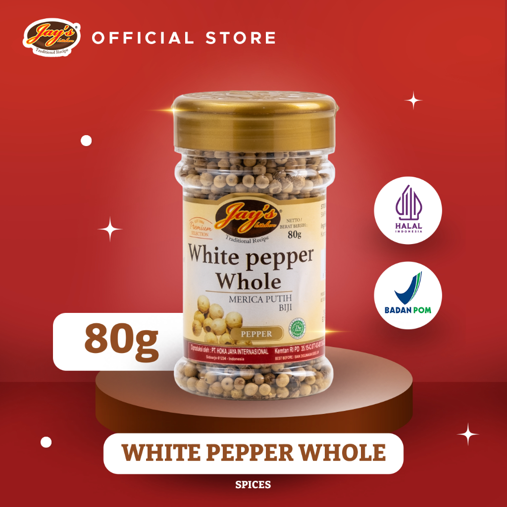 Merupakan butiran biji merica putih utuh yang terbuat dari merica putih pilihan dan siap pakai. Campurkan ke dalam masakan untuk makanan yang lebih spicy dan berempah. Merica putih memiliki aroma yang hangat dan lebih pedas dari merica hitam.