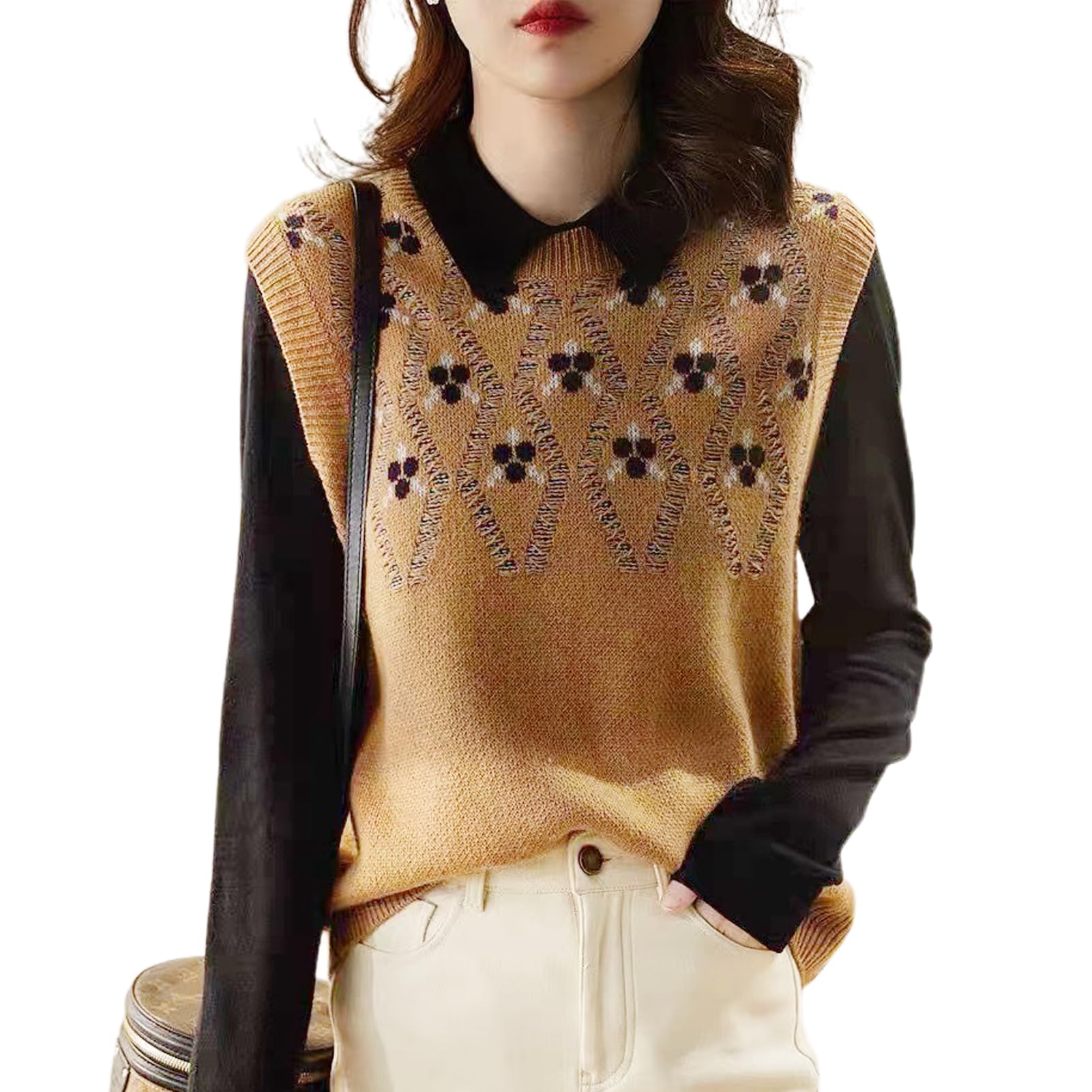 Jililoo Вязаный Геометрический Круглый Свитер Женский Жилет, Принт, Горловина, Без рукавов, Осень/Зима (Размер L, Кофе) кофейный