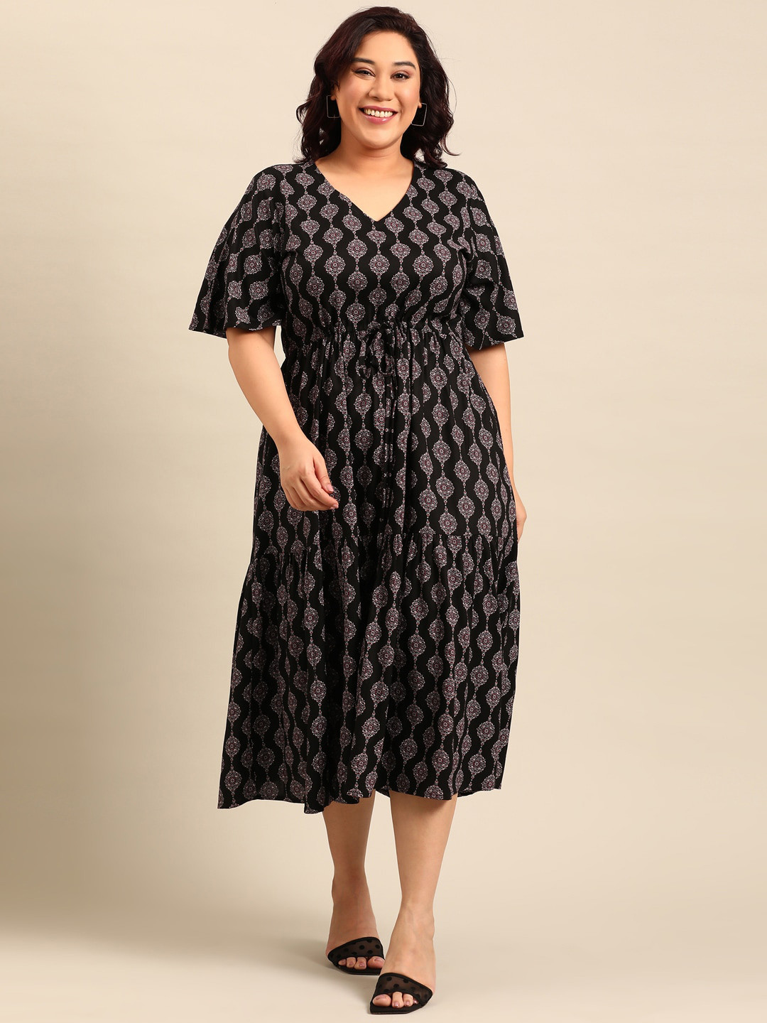 The Pink Moon Ethnic Motifs Printed Flared Sleeves Tie-Ups Tiered Midi Empire Dress, Black