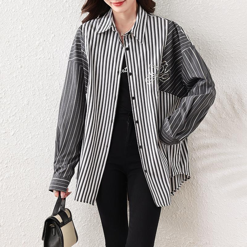 Johnature Весна Осень Поло с Воротником Полосатая Сшитая Рубашка с Длинными Рукавами Топы Повседневные Простые Свободные Нерегулярные Женские Топы XXXL серый