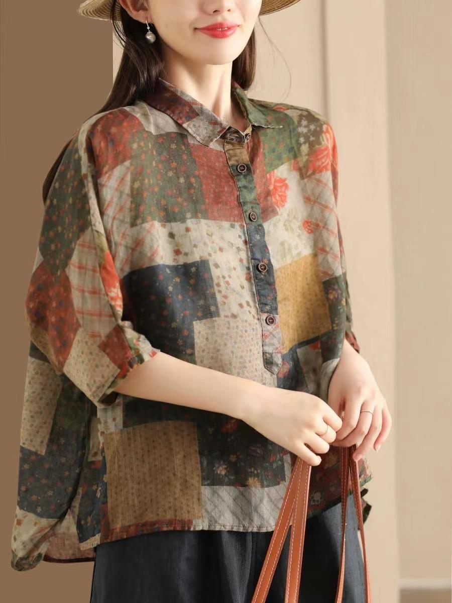 Johnature Женская летняя рубашка в винтажном стиле с отложным воротником и принтом Niche Personality, свободная рубашка с коротким рукавом XL