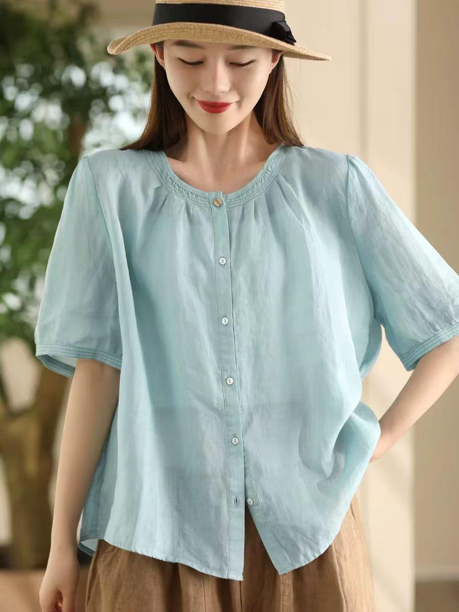 Johnature Женские рубашки в китайском стиле с круглым вырезом и коротким рукавом на пуговицах Летние однотонные винтажные женские блузки One Size синий