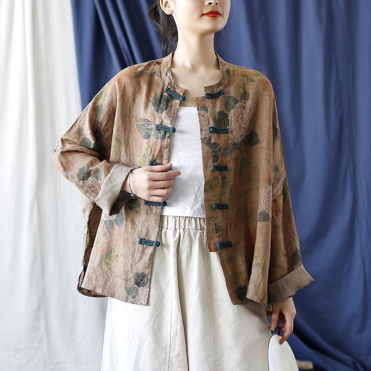 Johnature винтажная свободная льняная рубашка с длинными рукавами и ручной пряжкой, осенняя женская модная льняная однобортная рубашка One Size кофейный