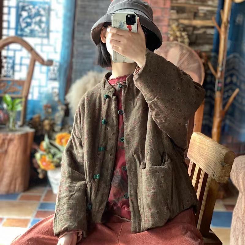 Johnature женская винтажная льняная хлопковая одежда с цветочным принтом, однобортная хлопковая одежда с длинными рукавами One Size кофейный