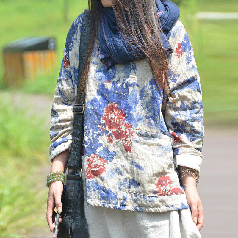 Johnature женские весенне-осенние топы с цветочным принтом, свободные футболки из хлопка и льна с v-образным вырезом и длинными рукавами One Size синий