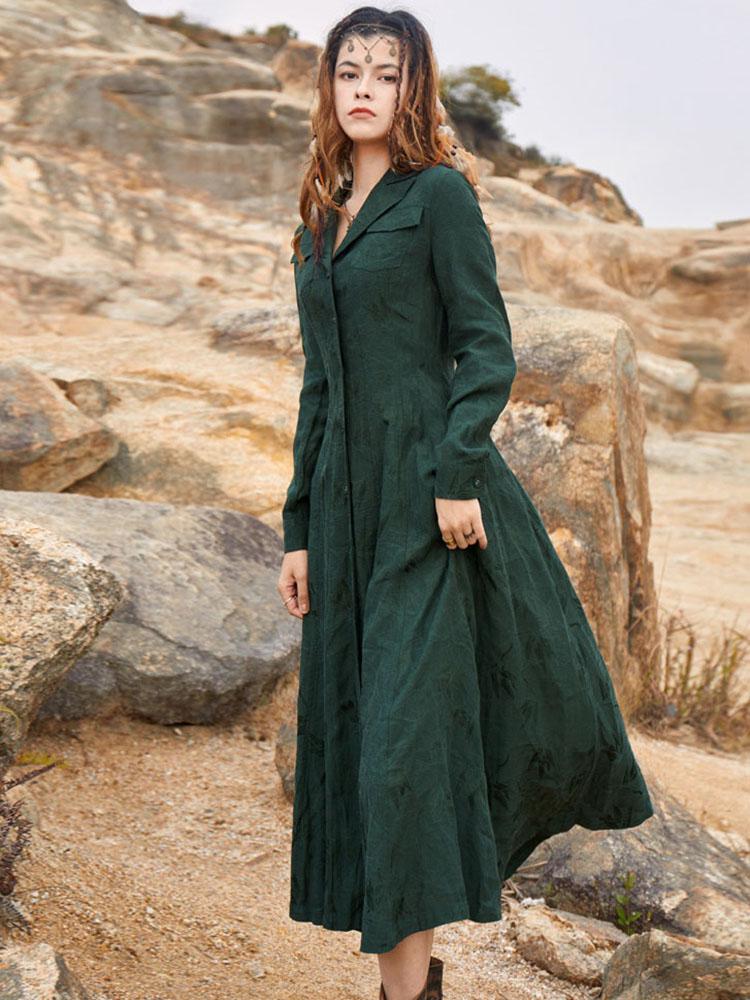 Johnature женское модное платье с поясом в стиле ретро, простое платье с отложным воротником и длинными рукавами, весенняя однотонная одежда M зелёный
