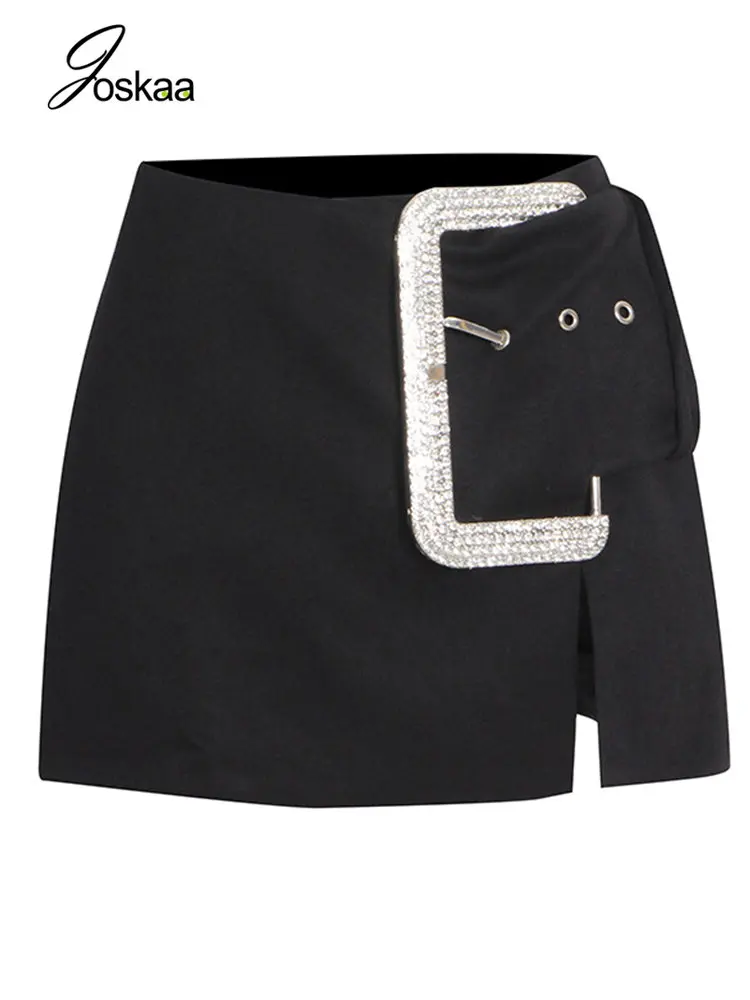 Joskaa, сексуальные мини юбки с кристаллами и пряжкой для женщин, зимняя одежда 2022, черная юбка с разрезом, женская уличная одежда