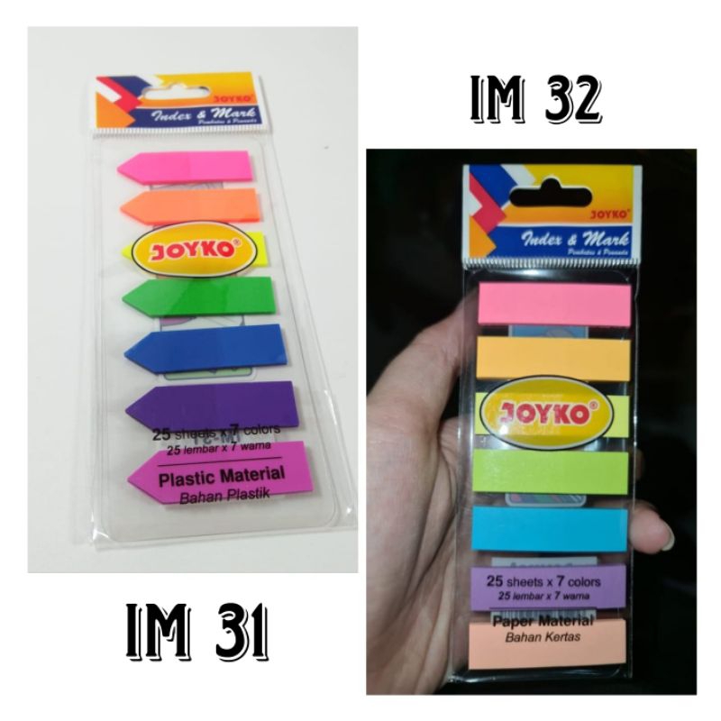 Index and Mark / Penanda / Pembatas Joyko IM-31 / Plastik Ukuran Produk : 4.5 x 1.2 cm ( per warna Index and Mark ) Paper Material ( Bahan Kertas ) 7 Warna : Merah Muda, Oranye, Kuning, Hijau, Biru, Ungu, Salem Jumlah per masing-masing warna : 25 lembar