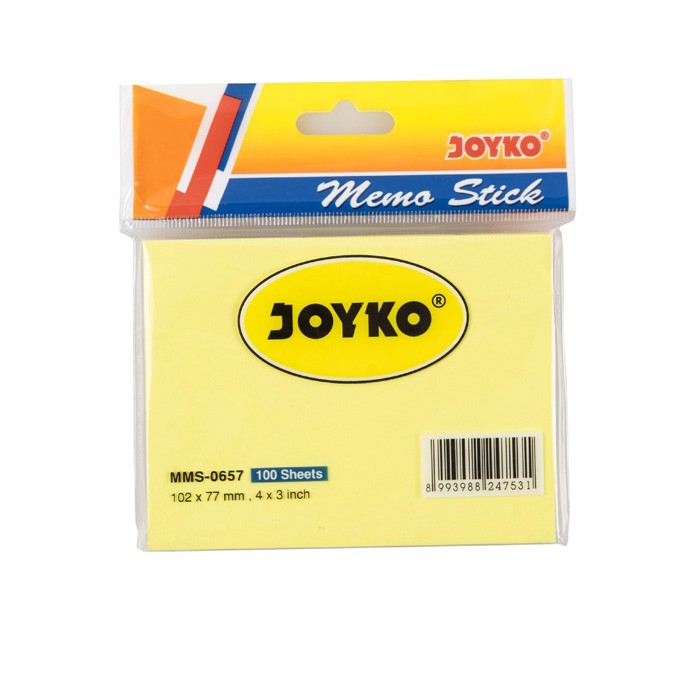 Joyko Memo Stick MMS-0657 merupakan kertas warna kuning untuk menulis sebuah catatan kecil yang dapat ditempel di kertas maupun permukaan vertikal seperti kaca dinding dan papan tulis putih.