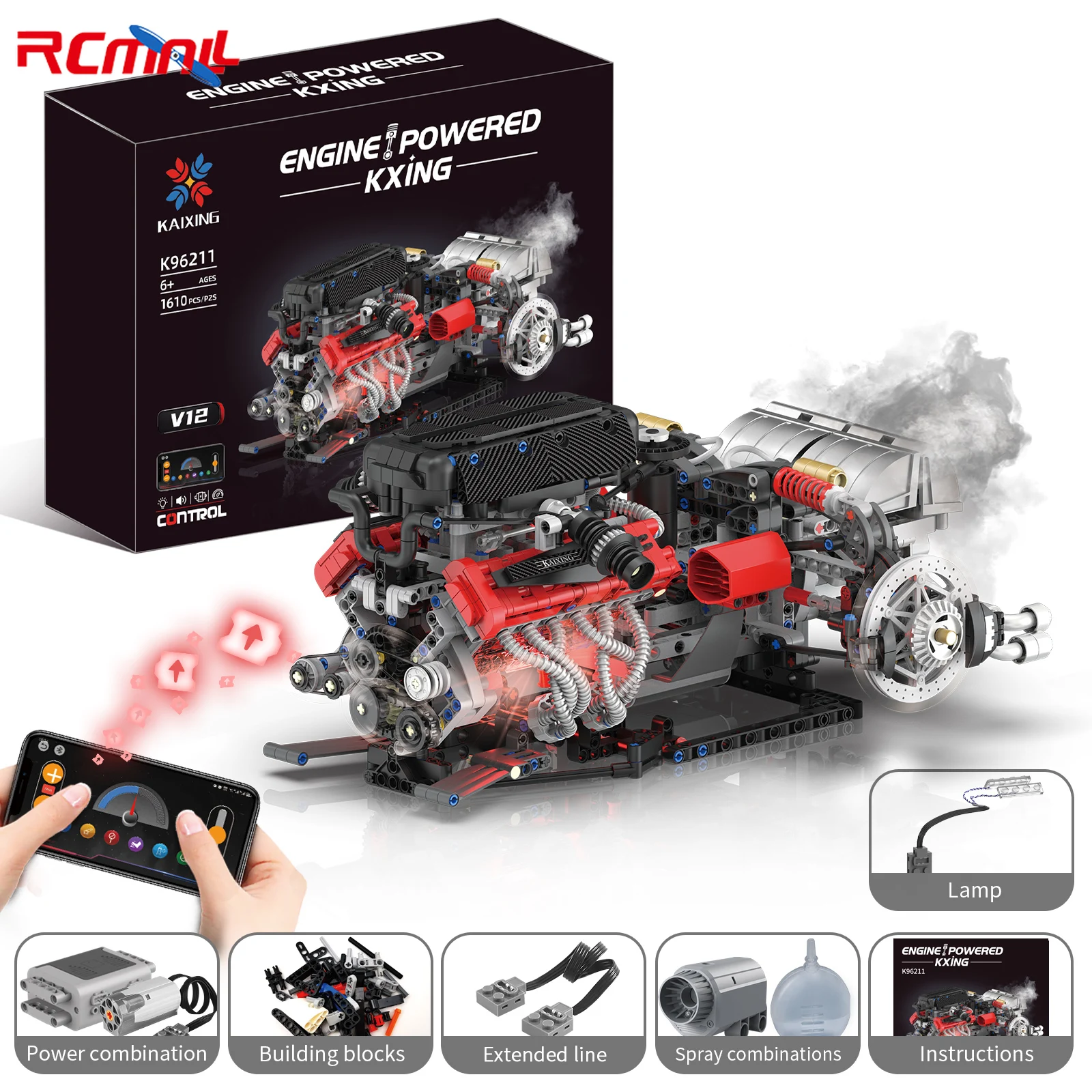 K96211 1610PCS Simulated V12 Supercar Engine Building-Block Model with Lighting App-Programmable MOC Bricks Kit