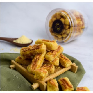 Kue kering berwarna kuning keemasan berbentuk persegi panjang dengan taburan keju renyah diatasnya, memiliki rasa dan aroma dari 3 jenis keju (parmesan, edam, cheedar) yang dipadukan, sekali buka toples aroma keju siap menusuk hidung semua umat, tenang aja, nusuknya gak sesakit ditusuk temen dari belakang......