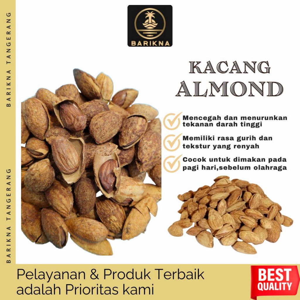 Almond merupakan salah satu kacang paling populer di dunia, Almond kerap dikonsumsi secara langsung baik sebagai camilan,tambahan sereal, pelengkap cokelat, hingga topping makanan, Selain rasa yang nikmat, almond bermanfaat yang tinggi untuk kesehatan. Kacang almond memiliki kandungan antioksidan, sehingga dipercaya bisa menurunkan risiko penyakit, terutama kanker.