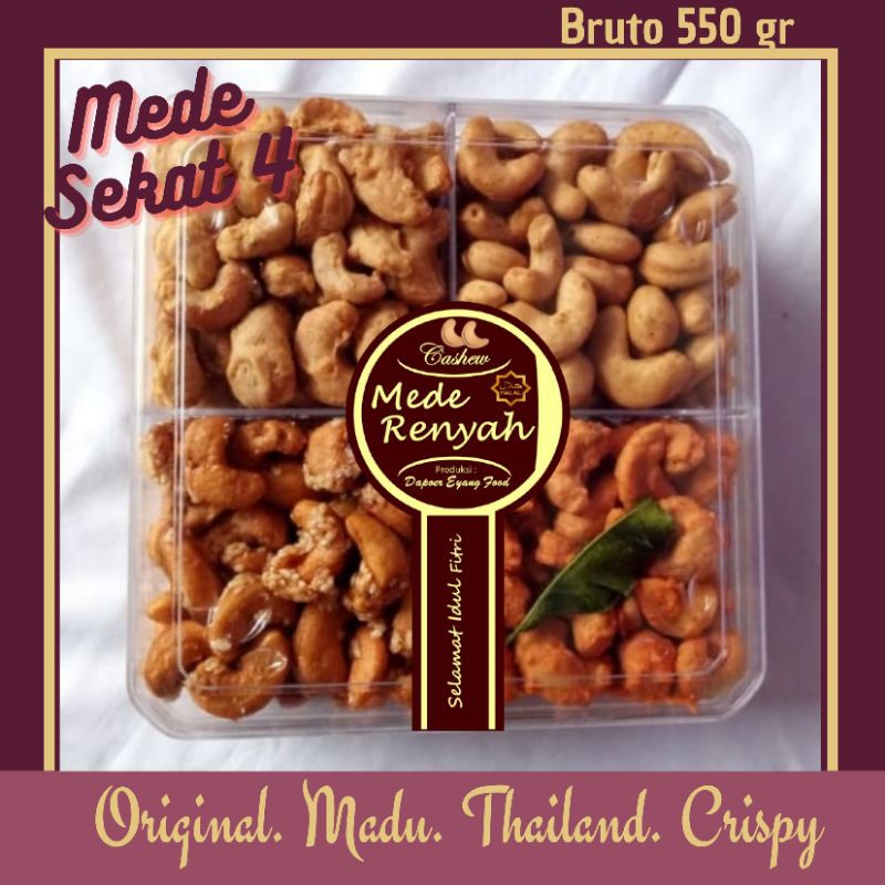 SALAH SATU PRODAK KAMI YAITU KACANG MEDE KEMASAN TOPLES SEKAT 4 RASA TERDIRI DARI RASA : ORIGINAL. MADU. THAILAND. CRISHPY