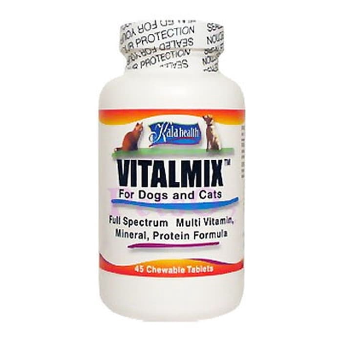 VITALMIX Chewable Tablets are more than an tasty all-natural multi-vitamin, itis the ultimate blend of amino acids, vitamins and minerals. Together thesenatural ingredients support a healthy immune system and circulatory functionsthereby promoting optimal health in your pet.The formula was developed by and for veterinarians to offer the essentialvitamins, minerals and proteins that may be absent in standard dog and cat food,or may be lost in the processing of food.In total VITALMIX contains 21 amino acids, 11 minerals and 14 vitamins. Theaddition of these 21 amino acids makes VITALMIX truly unique and revolutionaryin the world of multi-vitamins for pets.To make this already amazing health supplement even better VITALMIX alsocontains several additional ingredients, including whey; fish protein and wholeeggs to super charge the protein concentration.Your pet is going to love the taste and you are going to love their improvedhealth and vitality.As with all Kala Health products only top shelf raw materials sourced from theUSA are used.Ingredients:Dextrates, Maltodextrin, Whey, Natural Flavorings, Stearic Acid, DicalciumPhosphate, Silicon Dioxide, Potassium Chloride, Cellulose, Gum Ghatti, EggAlbumin, L-Carnitine, L-Taurine, Sunflower Oil, Ferrous Fumarate, CholineBitartrate, DL-alpha-Tocopheryl Acetate, Fish Protein Concentrate, AscorbicAcid, Zinc Acetate, Magnesium Oxide, Inositol, Pantothenic Acid, Niacin, VitaminA Palmitate, Riboflavin, Thiamine Mononitrate, Pyridoxine Hydrochloride,Manganese Gluconate, Vitamin D3, Copper Gluconate, Potassium Iodide, SodiumSelenate, Vitamin B12, Biotin, Folic Acid.Small Dogs (less than 20 lbs.): 1 tablet daily.Mid-sized Dogs (20-40 lbs.): 2 tablets daily