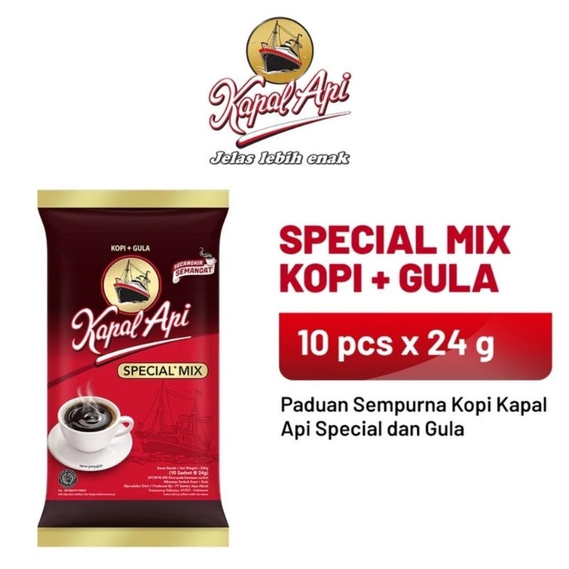 Kopi Kapal Api Special Mix terbuat dari paduan biji kopi berkualitas "Special" dan gula, menghasilkan aroma dan rasa yang jelas lebih enak, siap memberikan semangat untuk memulai hari. Tersedia dalam kemasan bag isi 10 sachet.