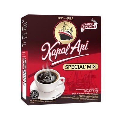Kopi Kapal Api Special Mix terbuat dari paduan biji kopi berkualitas "Special" dan gula, menghasilkan aroma dan rasa yang jelas lebih enak, siap memberikan semangat untuk memulai hari. Tersedia dalam kemasan folding box isi 5 sachet.