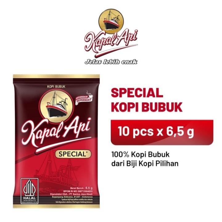 Kopi Kapal Api Special terbuat dari paduan biji kopi berkualitas "Special" menghasilkan aroma dan rasa yang jelas lebih enak, siap memberikan semangat untuk memulai hari. Tersedia dalam kemasan renteng isi 10 sachet kemasan 1 cangkir.