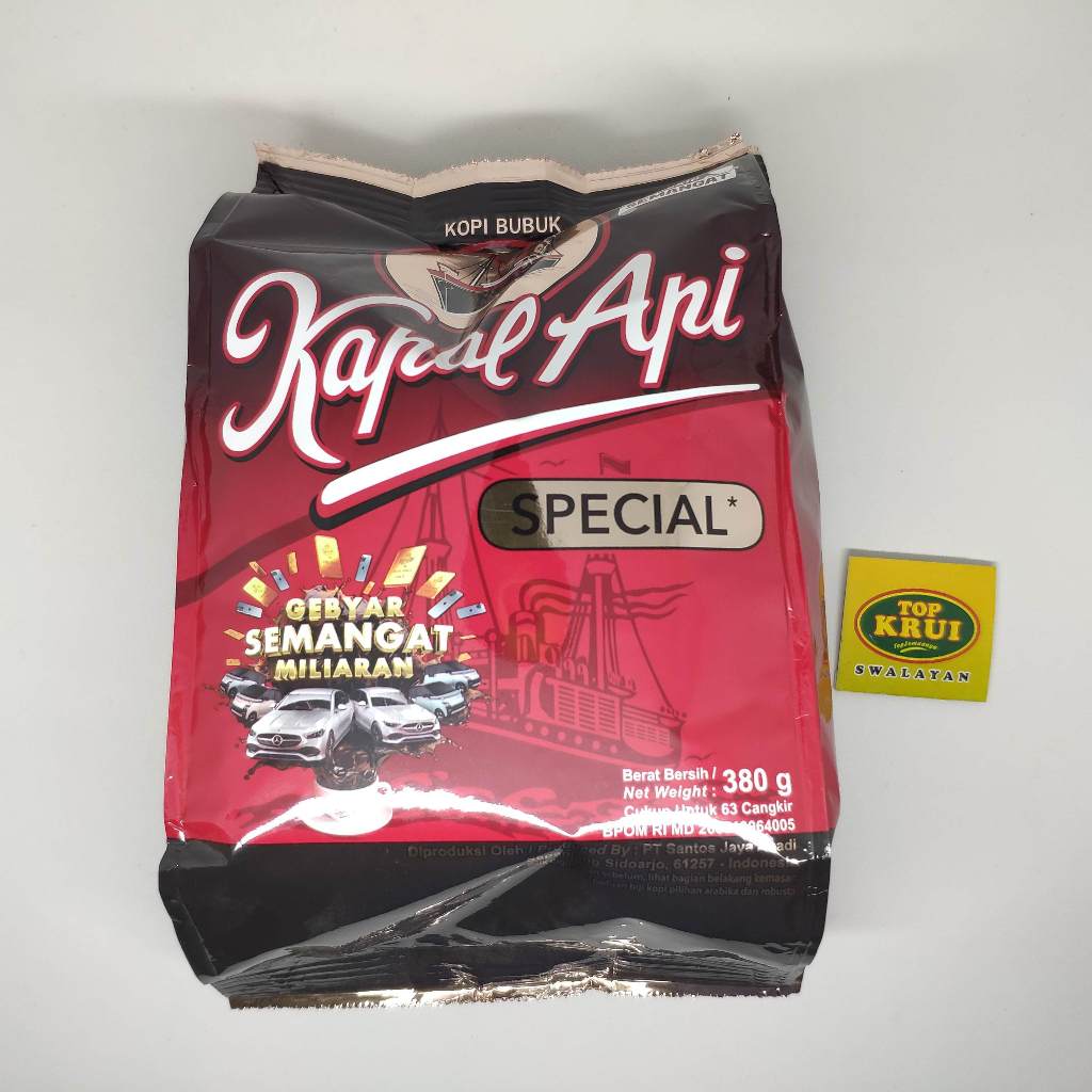 Kopi Kapal Api Special terbuat dari paduan biji kopi berkualitas "Special" menghasilkan aroma dan rasa yang jelas lebih enak, siap memberikan semangat untuk memulai hari. Tersedia dalam kemasan sachet 380gr, cukup untuk 50 cangkir..