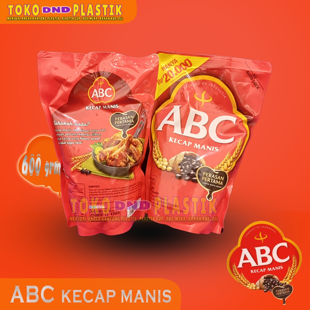 Kecap manis ABC 600g , dibuat dengan kedelai, gandum dan gula merah pilihan sehingga menghasilkan kecap manis dengan citarasa mantap, hitam dan kental.
