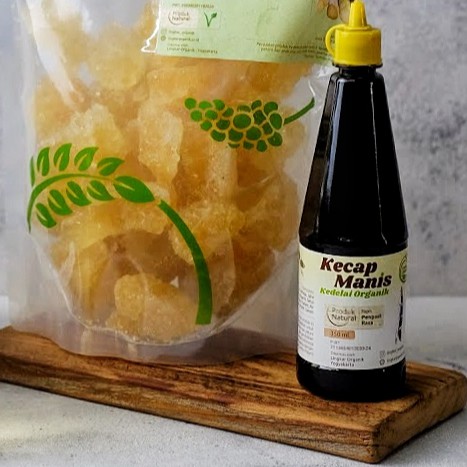 Kecap Manis terbuat dari kedelai organik yang di proses secara alami, di buat secara tradisional dengan rasa manis manis dari gula jawa organik, dengan bumbu dari rempah-rempah asli Indonesia dan pilihan.