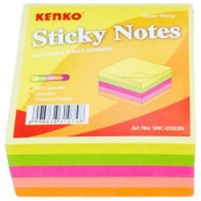 Sticky Notes Cube dari KENKO yang terdiri dari 5 warna neon yang terang. Setiap warna terdiri dari 80 lembar, total 400 lembar. Harga ekonomis, kualitas rekatnya terjamin.