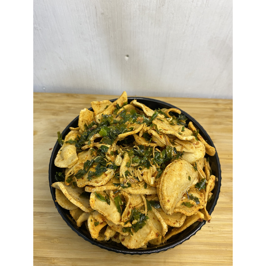 basreng dengan aromatic yang khas dari daun jeruk yang fresh serta tambahan bawang goreng dan juga rasa pedas dari cabai rawit asli,