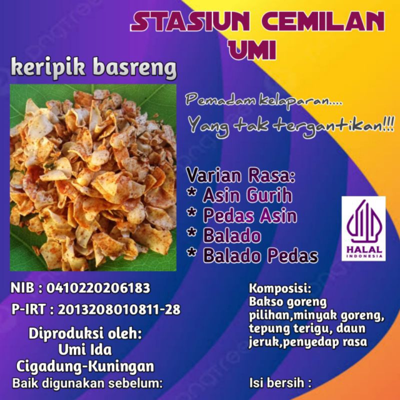 *KERIPIK BASRENG ANEKA RASA* (STASIUN CEMILAN UMI) PEMADAM KELAPARAN 100% HALAL #VARIAN RASA : - ASIN GURIH - PEDAS ASIN - BALADO - BALADO PEDAS #KOMPOSISI : - BAKSO GORENG PILIHAN - TEPUNG TERIGU - DAUN JERUK - PENYEDAP RASA DIPRODUKSI OLEH UMI IDA CIGADUNG-KUNINGAN >>SELAMAT BERBELANJA
