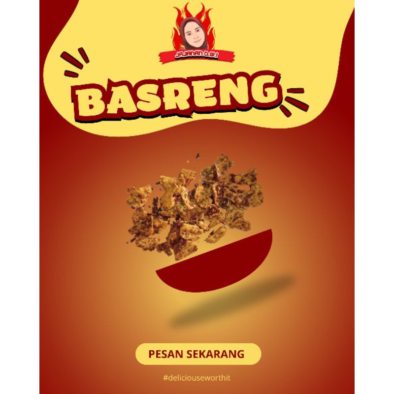 KERIPIK BASRENG / sering di sebut BAKSO GORENG, bakso ikan yg di goreng tipis kriuk ini jadi cemilan yang nagihin pedes gurih nya terbuat dari rempah asli. Yang membedakan kripik basreng di D.W.I, yaitu bumbunya bukan hanya cabai ,asin,& daun jeruk saja. Tapi di jajanan D.W.I bumbu terdiri dari, Bawang putih,kencur, cabai,daun jeruk dan bumbu asin