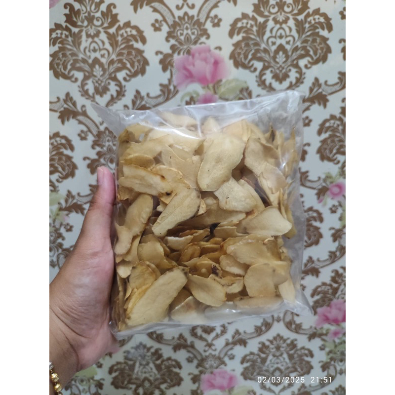 keripik gayam terbuat dari bahan dasar buah gayam, buah ini memiliki bentuk mirip dengan jengkol,tetapi tidak berbau dan rasanyapun enak, gurih, Sehingga bisa dijadikan pilihan sebagai camilan ataupun oleh-oleh.