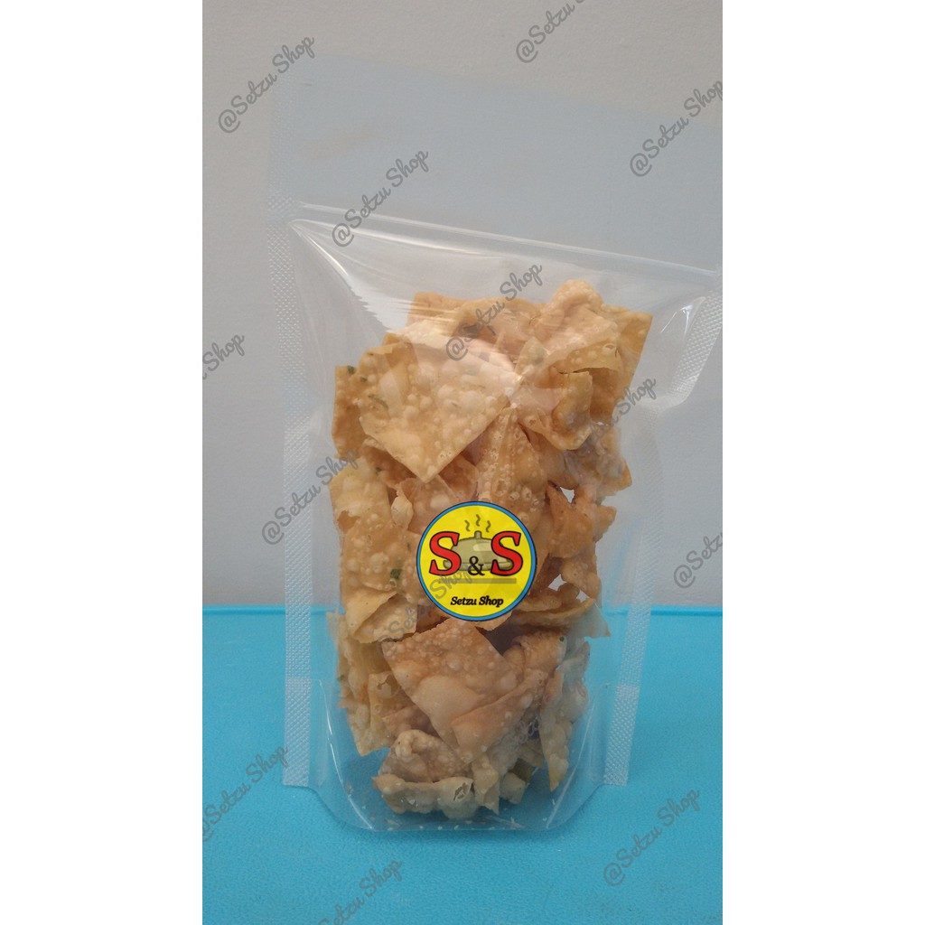 Keripik pangsit renyah dan gurih, tanpa bahan pengawet, sehat, higienis, dijamin HALAL.