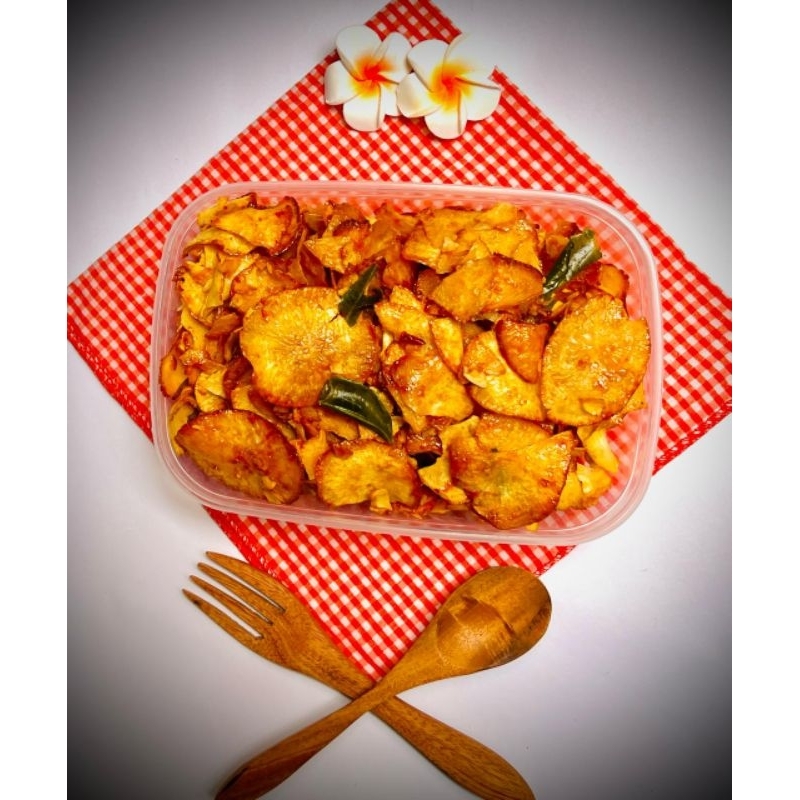 keripik singkong yang rasanya renyah, gurih, pedas, manis, asin