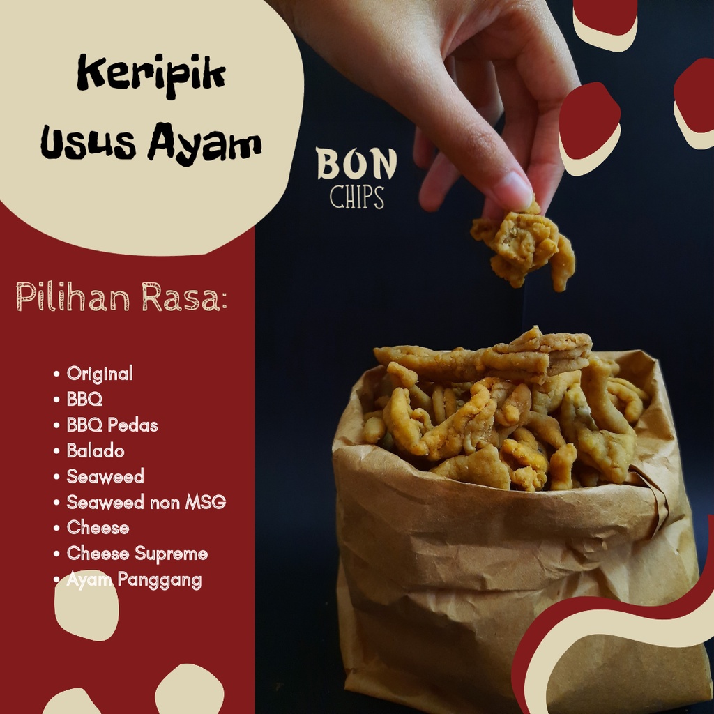 Keripik usus ayam renyah dan gurih, laziiisss dengan berbagai varian rasa. Varian rasa bisa dipilih sesuai selera.